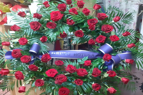 Corona de rosas y verdes ornamentales con diámetro de 90cm e incluye cinta con texto de condolencias.